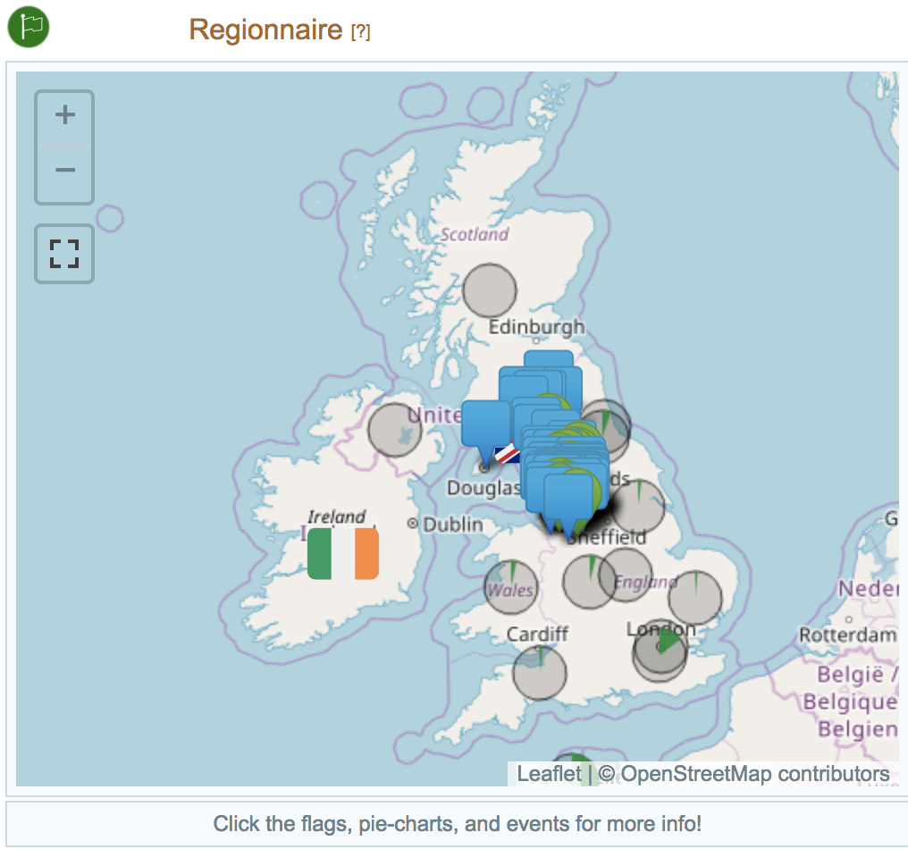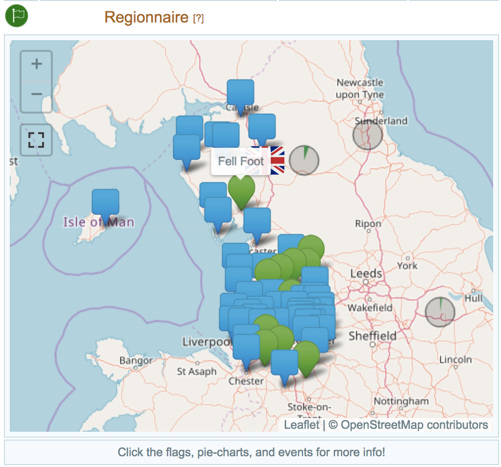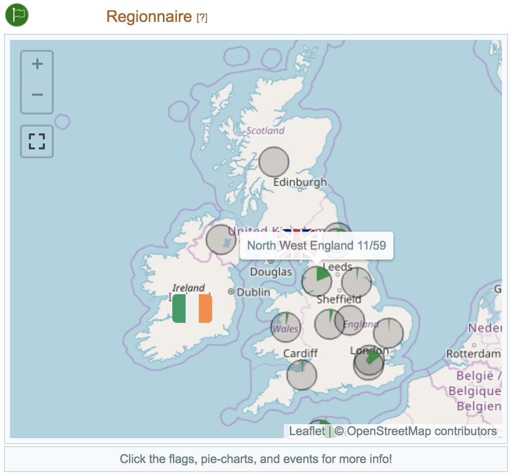 If you click on a sub-region, you will be presented with the events that make up that region - coloured/shaped in the same was as the other maps, with green-rounded markers for events you have been to, and blue-squared markers for events you haven’t been to yet.