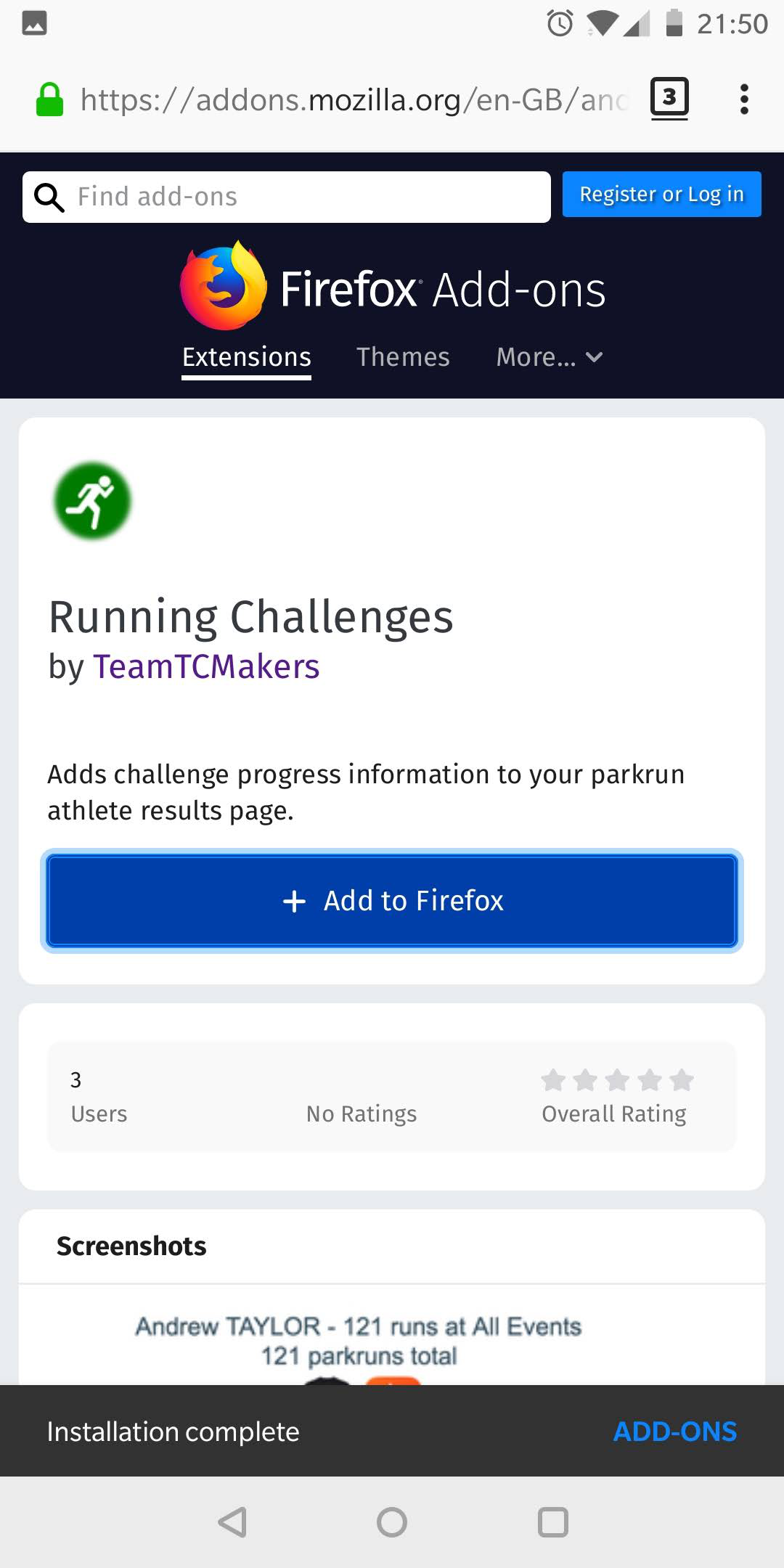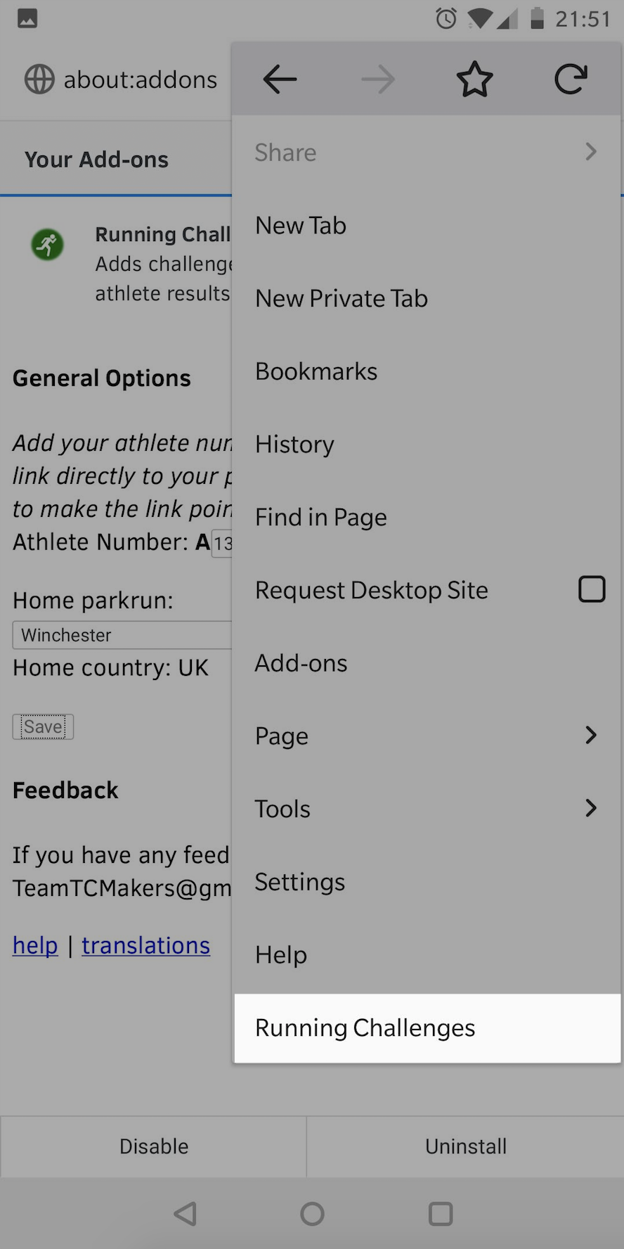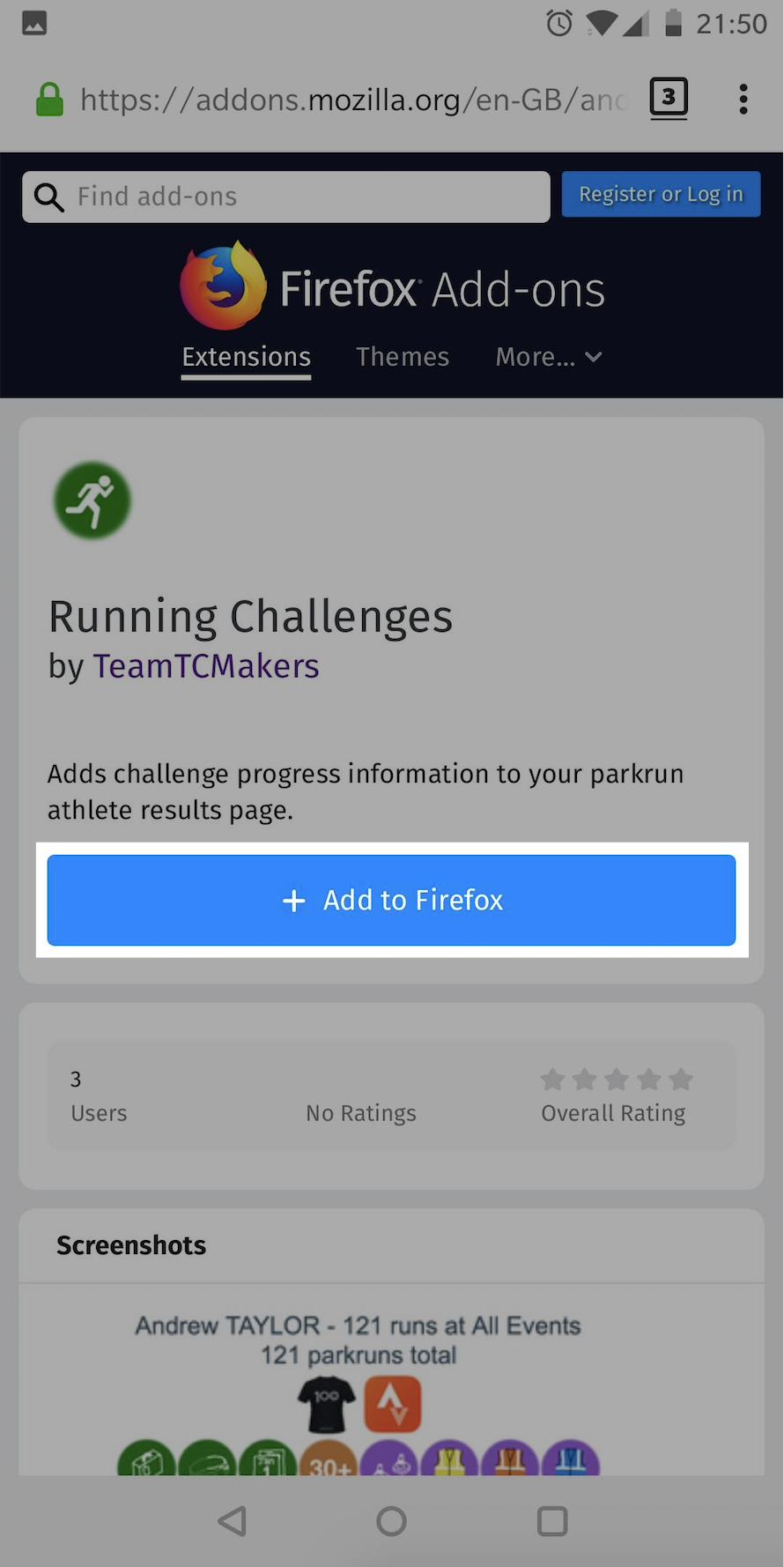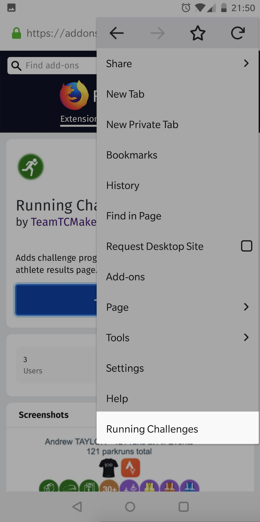 Start by going straight to the Running Challenges page on the Firefox Add-ons website in Firefox for Android.