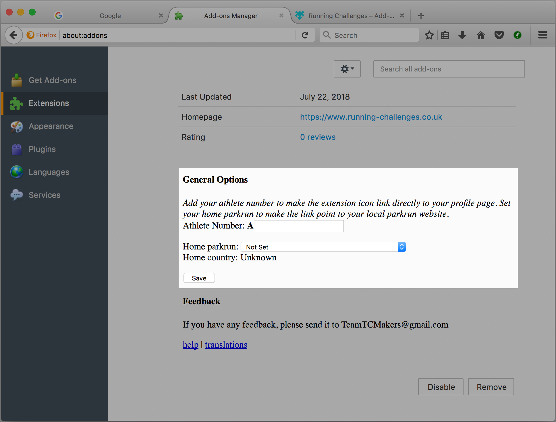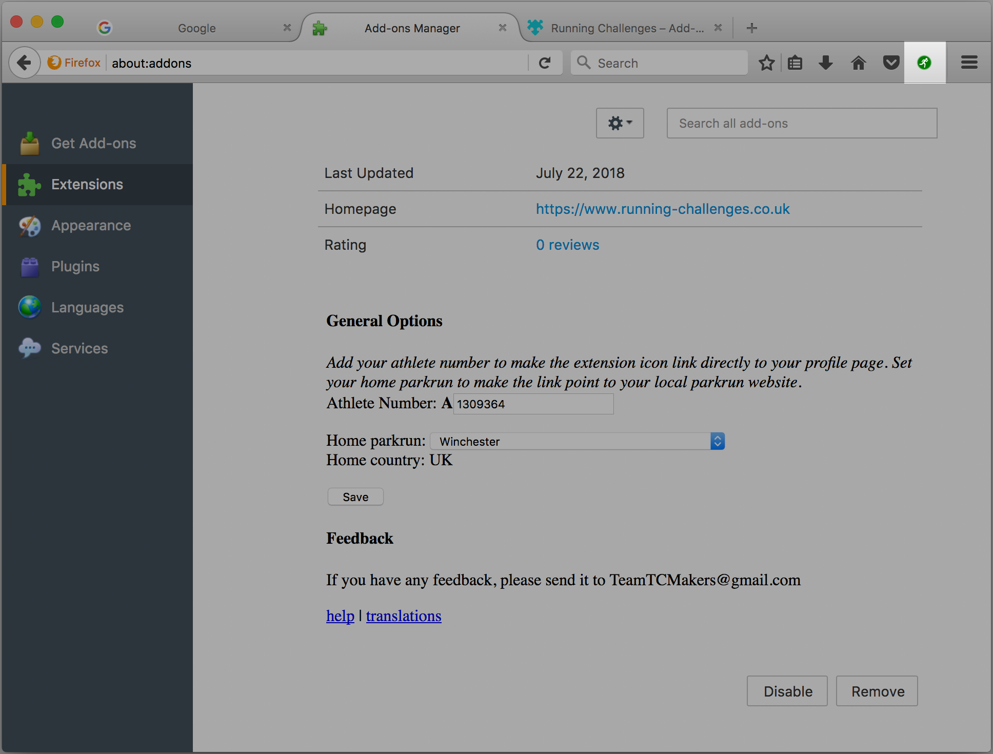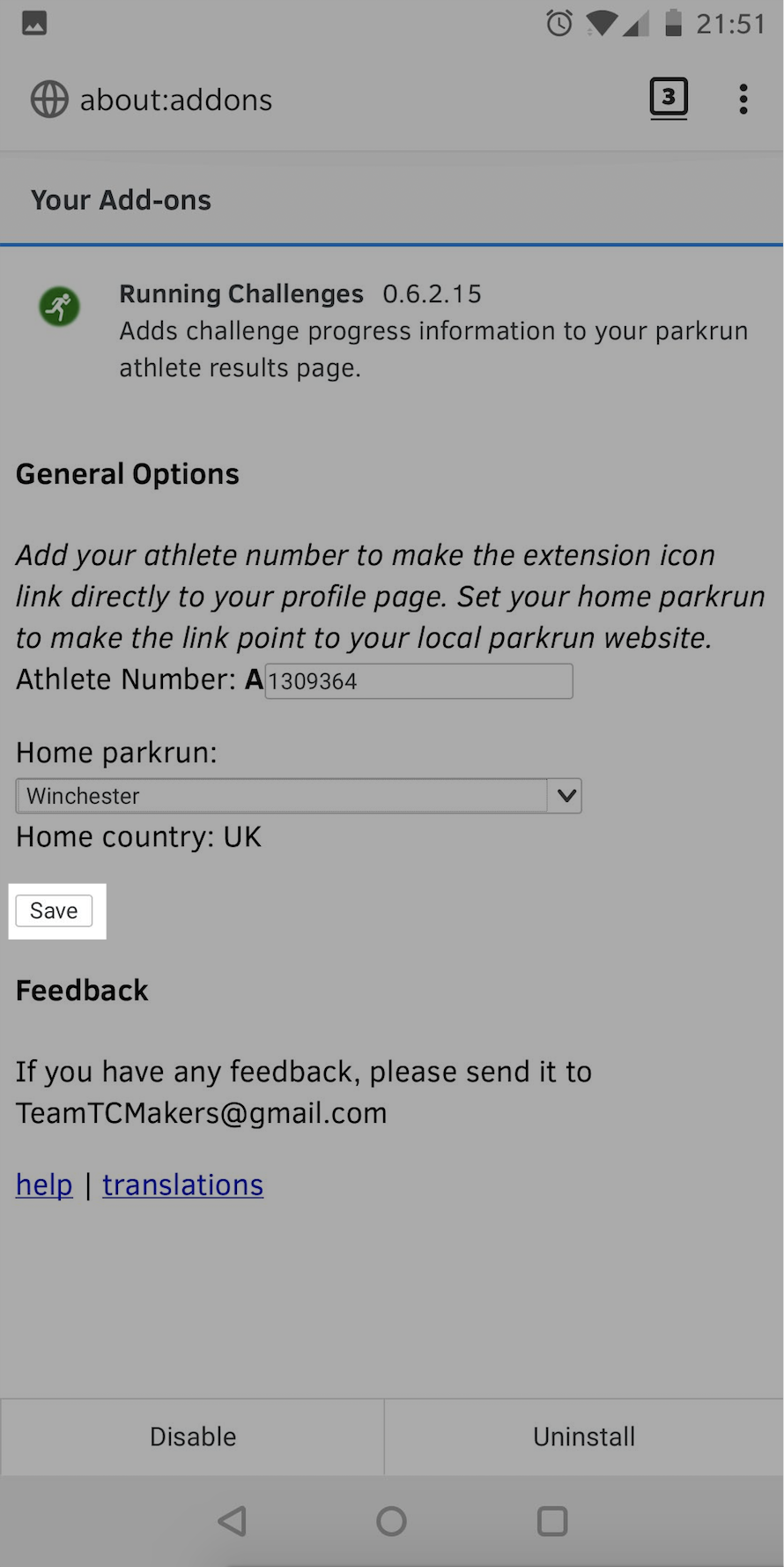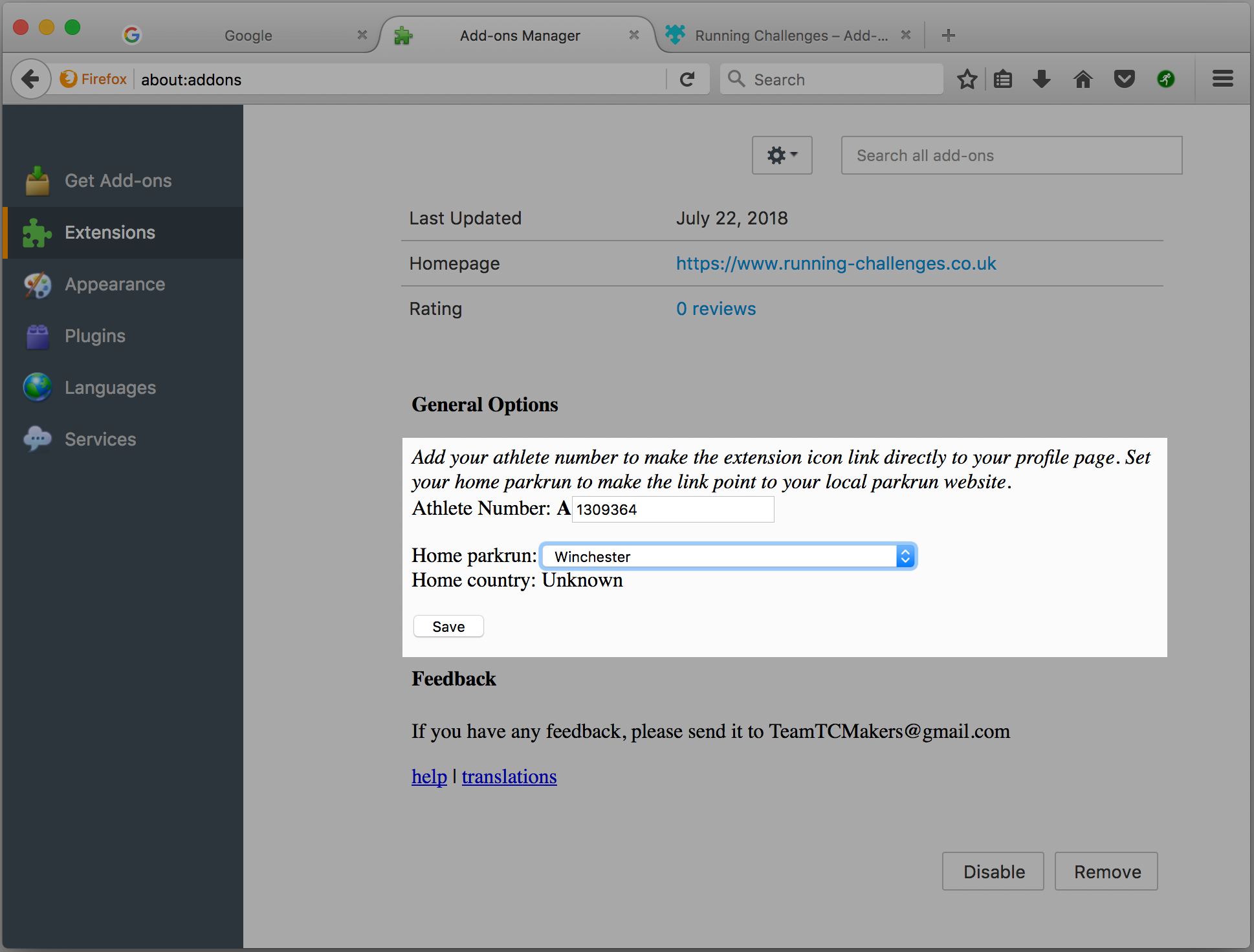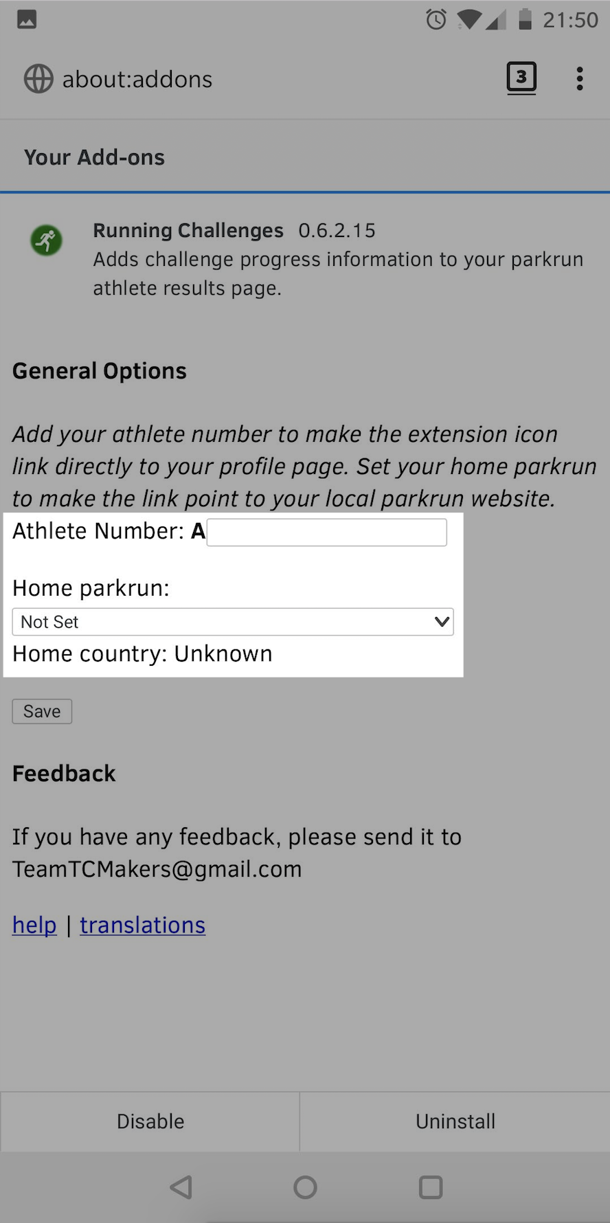 2. Once installed, configure the extension with your parkrun number and home parkrun - this is usually your closest parkrun, and among other things, is used when calculating the distances to other parkruns.