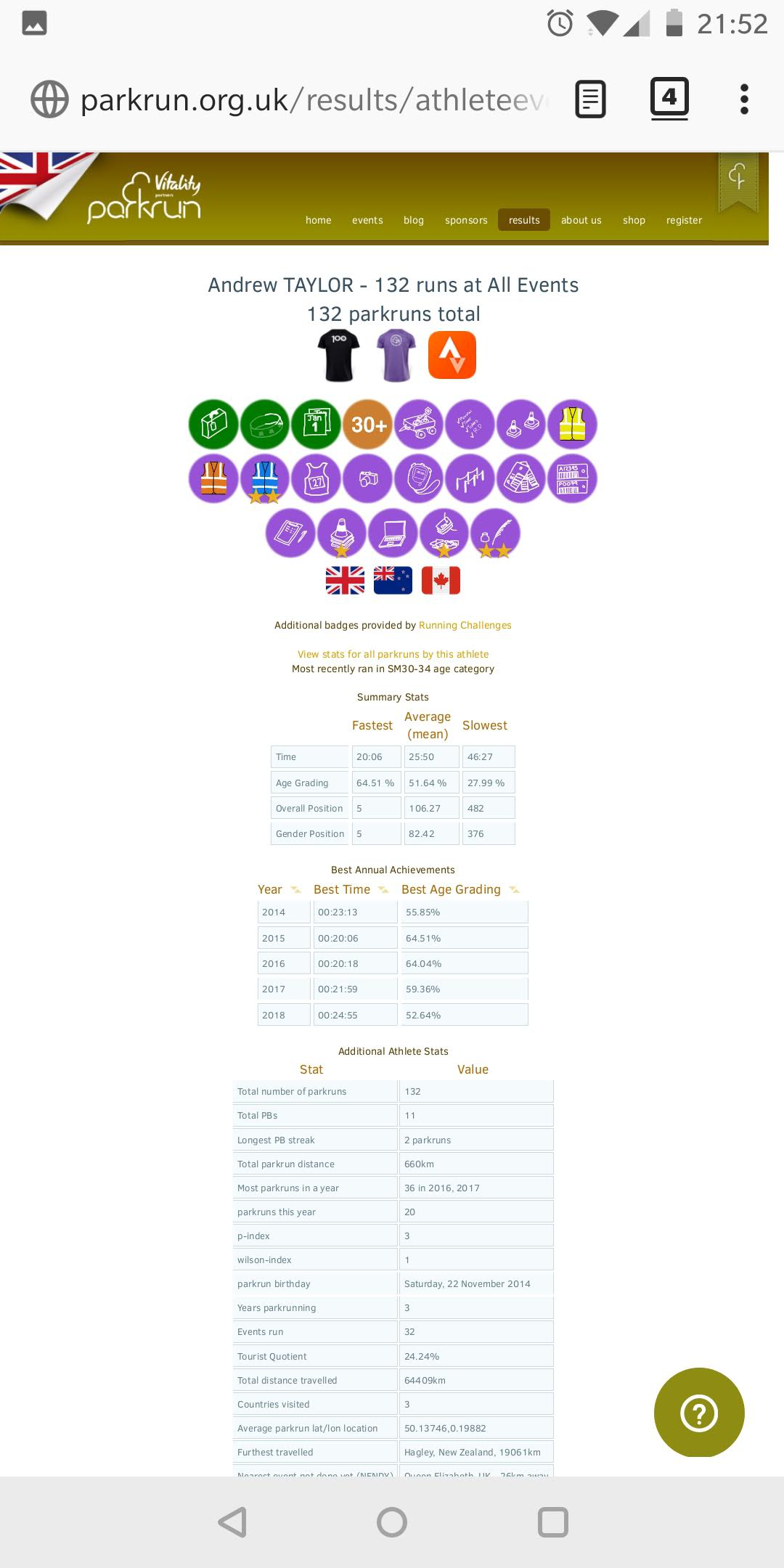 3. Visit your own parkrun page, or anyone else’s page, to see the badges and challenge completion statistics! - N.B. If you have filled in your athlete ID and home parkrun the extension will take you to your profile when you click the newly-added Running Challenges icon/menu item.