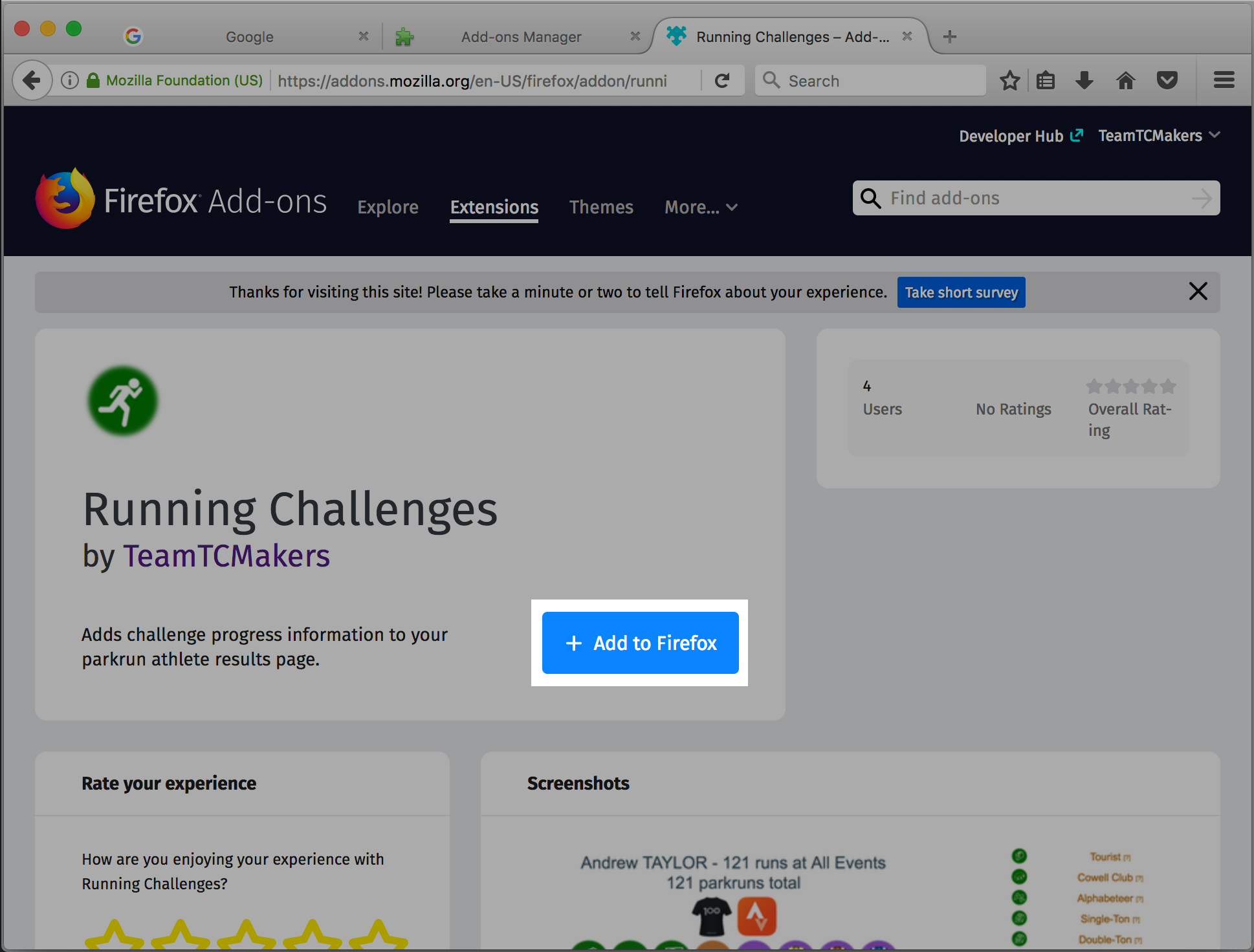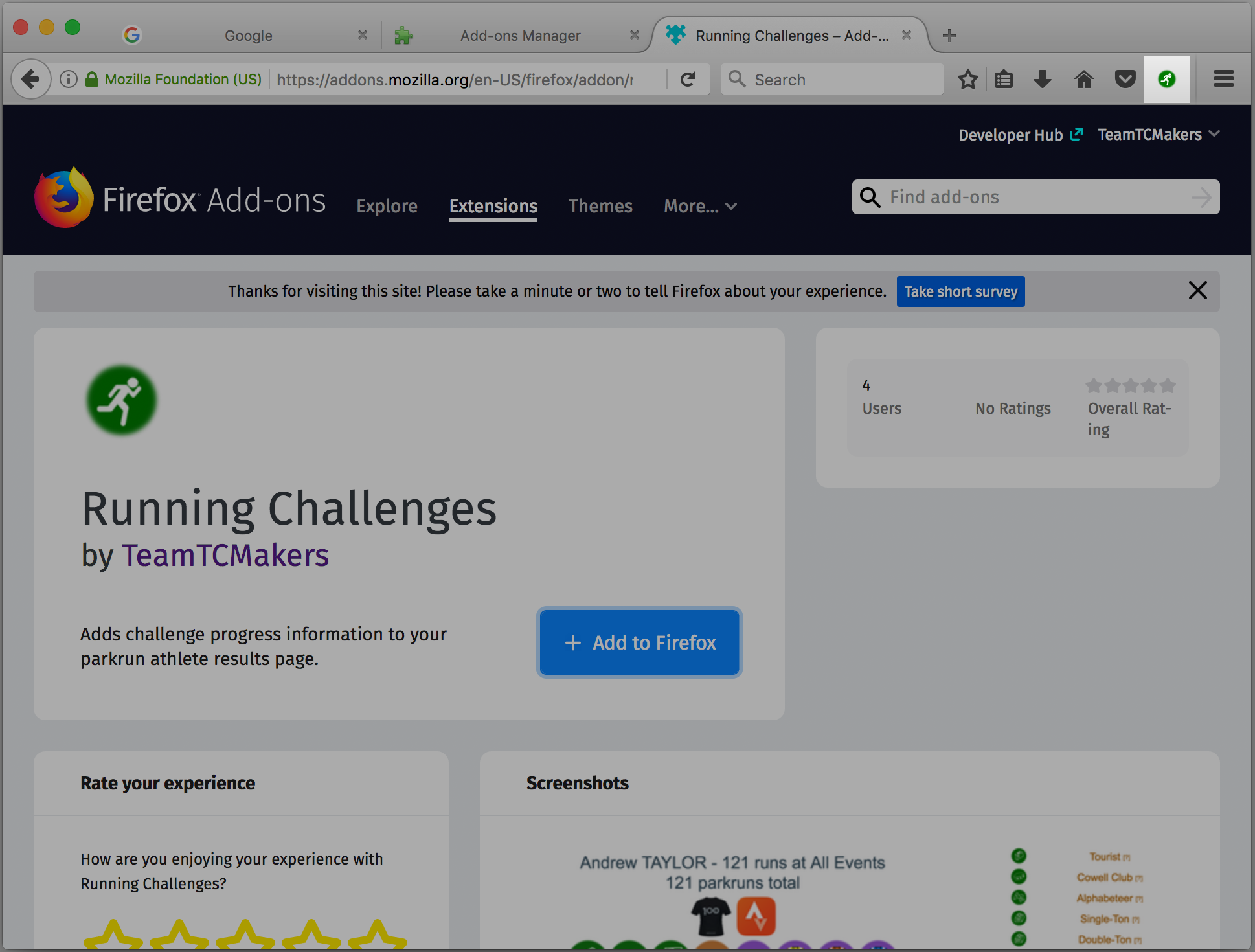 Start by going straight to the Running Challenges page on the Firefox Add-ons website in Firefox.