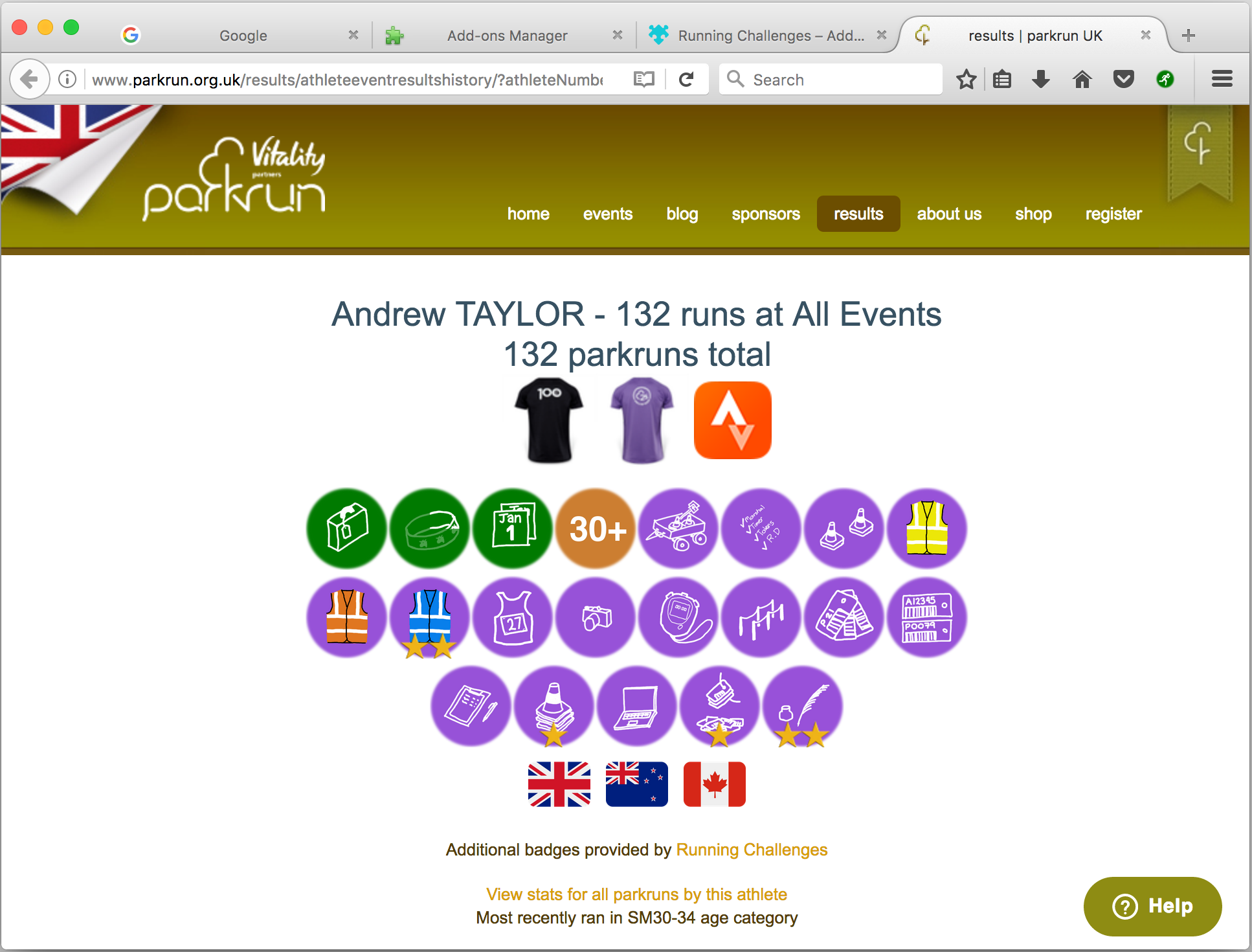 • The shortcut icon in the toolbar will take you to whichever athlete profile is configured in the options, but the badges and challenges are added whenever you visit a parkrun athlete page - no matter if you click the icon or not. This means that if you want to have links to many different profiles, e.g. your whole family, you can bookmark them in your browser as normal and use those links, or navigate to those athlete pages directly.